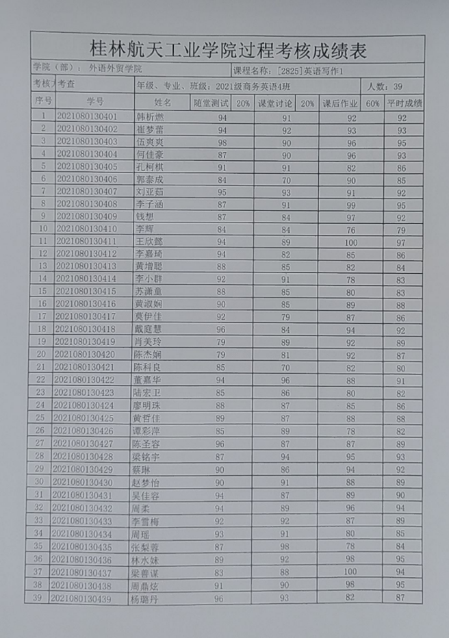 【1101】经济学原理(A)李海红老师所带班级平时成绩公示